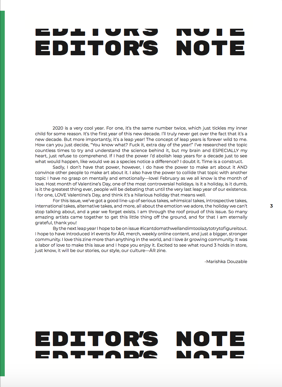 My precious passion project, ÄR ZINE, is a self-printed zine that focuses on creating a safe place for POC & LGBTQ+ artists to create art and explore themselves freely.